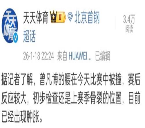 和宁波富邦的比赛,曾凡博和杰曼都出现了伤病情况,其中曾凡博的情况有些严重,他是腰部被撞了一下,赛后出现了肿胀的情况,检查是上赛季出现骨裂的地方。北京首钢稍后会安排曾凡博进行更详细的检查,但估计会休息一段时间。
