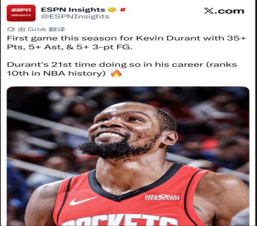 3.这是杜兰特火箭生涯首次35+5+5三分的场次;