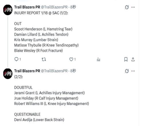 大概率缺阵的包括:格兰特(左跟腱伤病管理)、霍勒迪(右小腿伤病管理)、罗伯特-威廉姆斯(右膝伤病管理)
