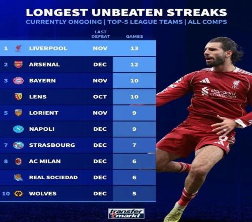 德转盘点了目前五大联赛球队各项赛事现存最长不败场次榜,具体如下: