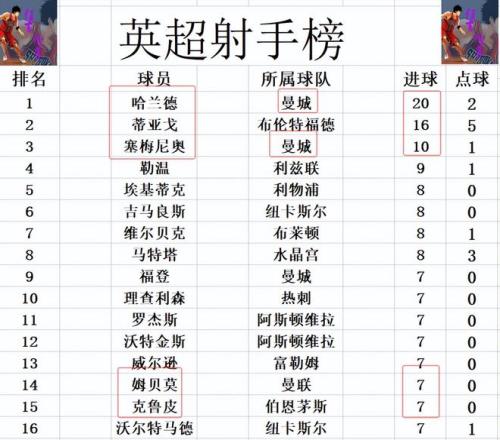 射手榜方面,哈兰德下半程有点低迷,昨晚还是没有进球,20球继续李刚跑,蒂亚戈16球紧随其后。塞梅尼奥未能收获来到曼城后的首个联赛进球,还是10球排在第3。克鲁皮,姆贝莫进球,追上福登,理查利森等人7球刚好挤入前十。